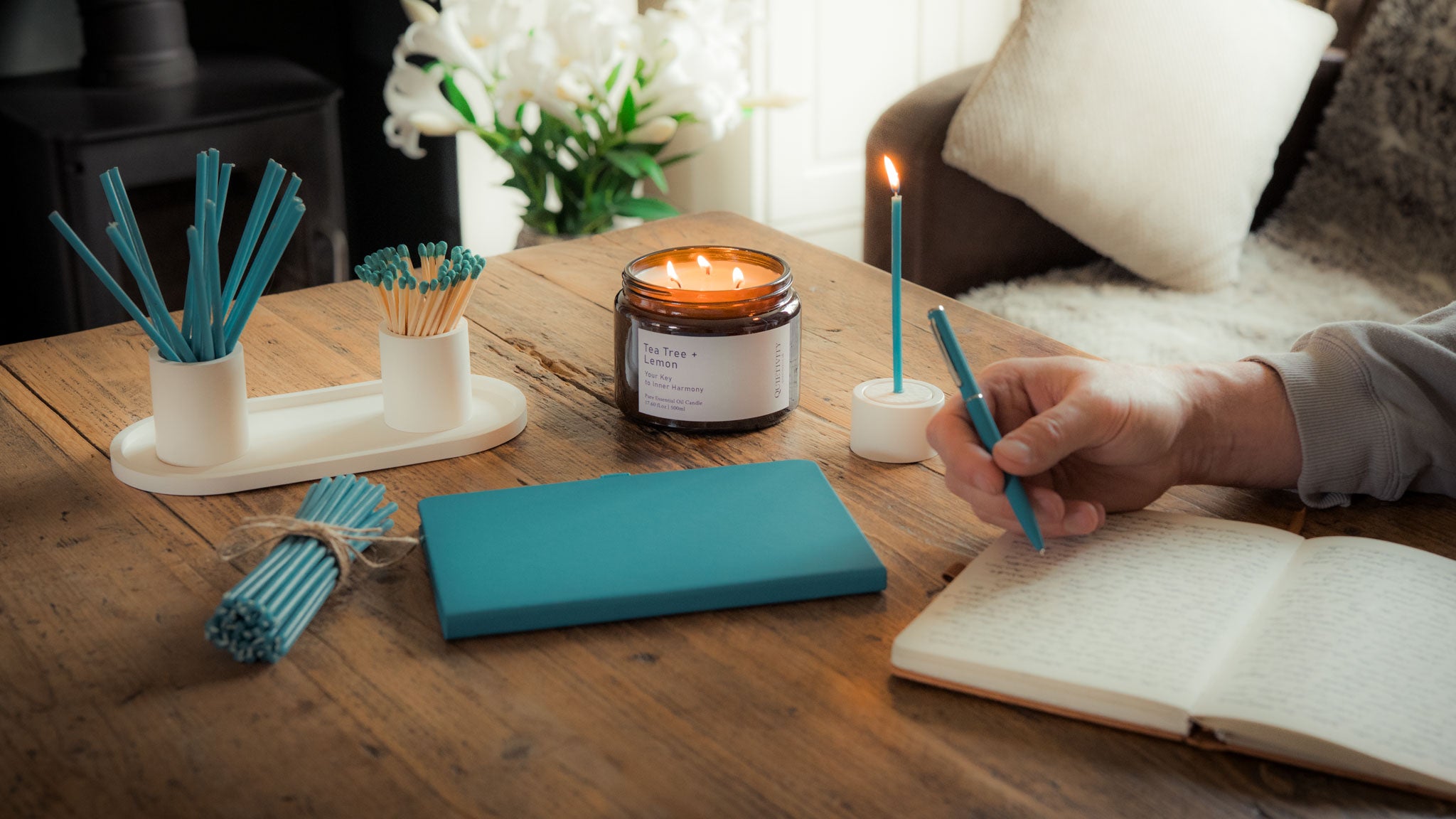 Find a quiet spot where you feel safe and comfortable. It could be your desk, your favourite chair, or a corner of your bedroom. Keep your journal and pen nearby. Light your candle and place it in its holder. This is your time.